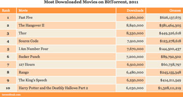 <table class="t1" summary="Top 10 downloaded movies in 2011 using BitTorrent, in descending order, listing number of downloads and worldwide cinema grosses">